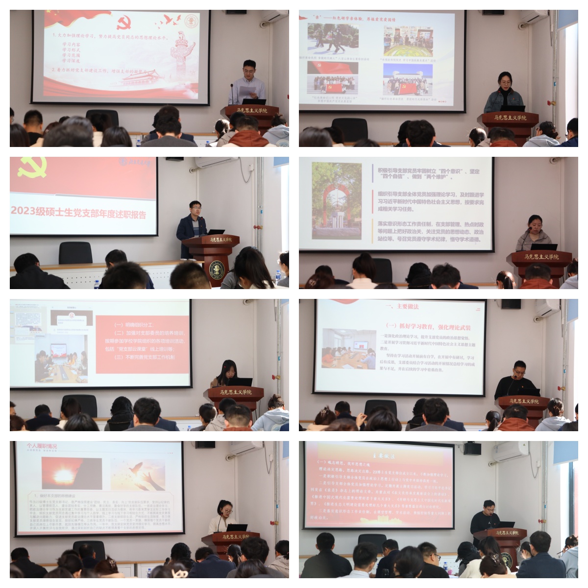 8个研究生党支部分别从支部特色做法、缺点及不足、今后工作思路三个方面围绕理论学习、组织建设、党员发展、“三会一课”落实情况、品牌创建等方面进行述职。述职结束后田永静、刘慧敏分别就博士生党支部和硕士生党支部述职情况进行点评,并结合支部实际情况提出具体的指导意见。