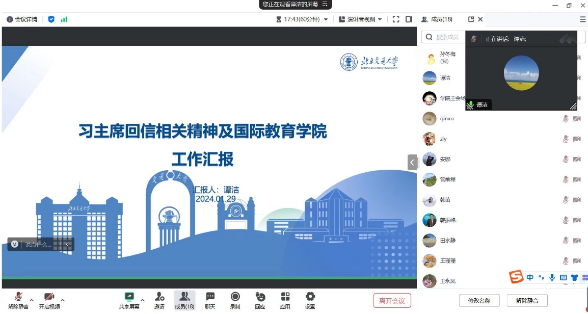 1月29日,学院召开党委理论中心组(扩大)学习会议,邀请国际教育学院副院长谭洁专题讲授习近平总书记重要回信精神。学院党委委员、各教师党支部书记、习近平新时代中国特色社会主义思想概论教研部教师党支部全体教师以线上和线下相结合形式参加学习。会议由学院党委书记孙冬梅主持。