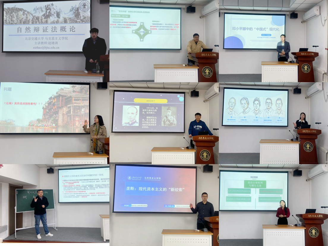 赵绪涛老师选取了自然辩证法概论的“马克思主义自然观”章节,讲述了自然观的历史纵览。丁帅老师剖析了西方“普世价值”的实质,引导学生以社会主义核心价值观为引领,坚定价值观自信。刘国瑞老师以“邓小平眼中的‘中国式’现代化”为主线,解读了“历史转折中的邓小平”“邓小平对‘中国式’现代化的基本设想”。唐娒嘉老师从“《边城》:美丽总是愁人的”引入,深入解答了“《边城》真的是田园牧歌吗”。王楠老师从多维度分析了戊戌变法的失败原因,并据此带领学生总结了变法失败的经验教训。冯楠楠老师从人工智能这一热点引入,讲述了世界的物质性及发展规律、物质与意识的辩证关系。王晨老师围绕“如何理解新时代爱国主义的内涵和本质”,重点解读了如何理解并认同爱国爱党爱社会主义相统一。李家瑞老师以“垄断:现代资本主义的‘新绞索’”为题,引导学生深刻理解社会主义取代资本主义是历史的必然趋势。张欣老师选取“法律权利和法律义务的关系”的相关内容,引导学生理解法律权利和义务的统一,提升法治素养。